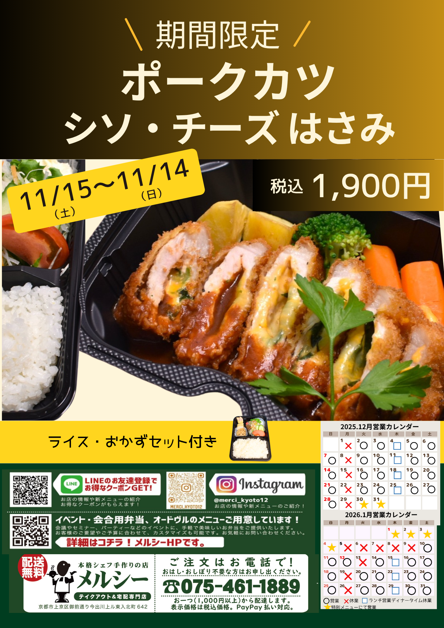 11/15(SAT.)~12/14(SUN.)ポークカツしそ・チーズはさみ (ライスセット付き)¥1,900‐(税込) ラ