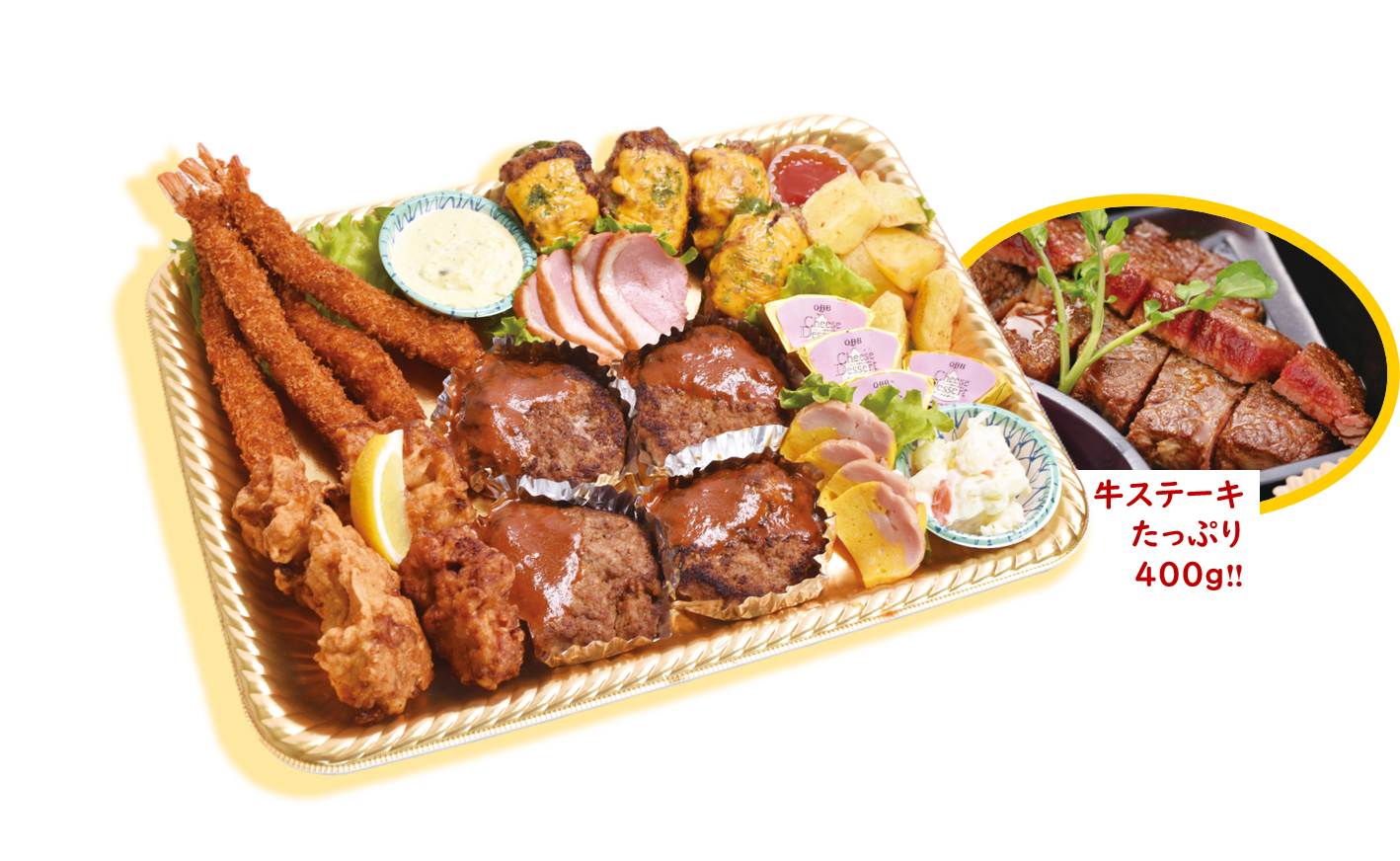 自家製ハンバーグ×4/大エビフライ×4/チキン唐揚げ×4/ピーマンのファルシ×4/鴨スモーク/ポテトフライ/鶏とかぼちゃのテリーヌ/オードブルチーズ/ポテトサラダ/野菜のキッシュ