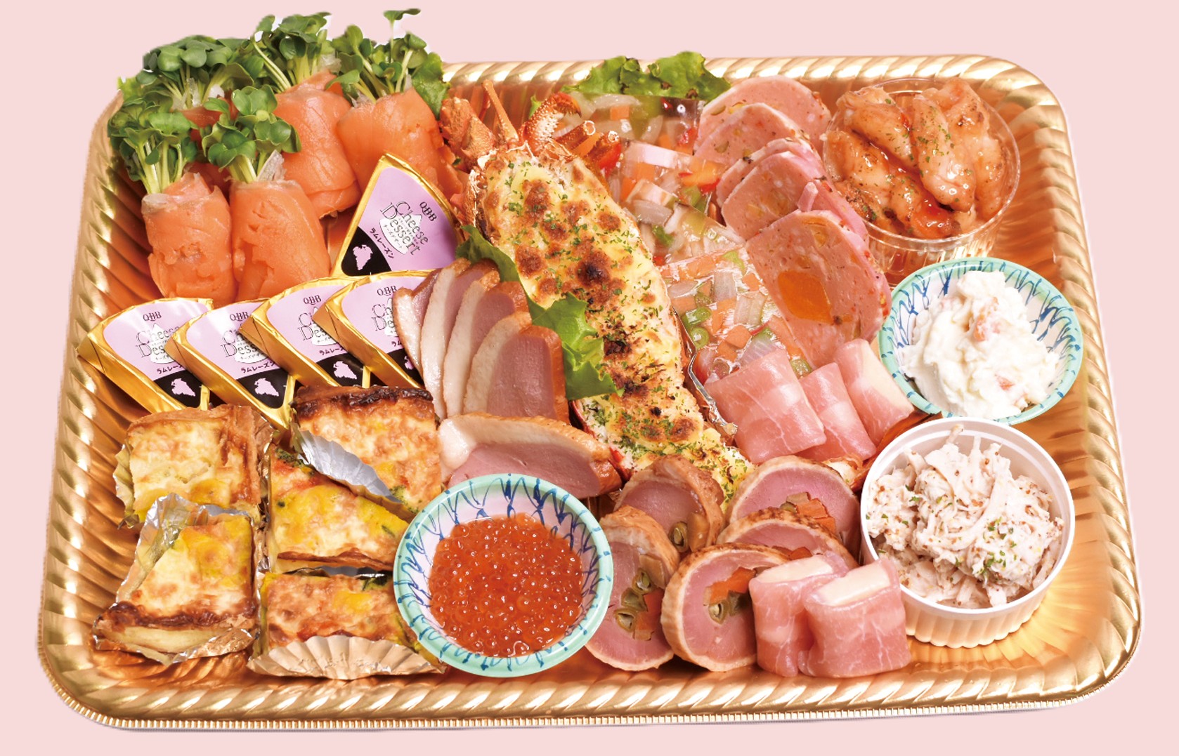 ロブスターテルミドールグラタン/スモークサーモンのカイワレ巻き/オードブルチーズ/アプリコットベーコン巻き/ハムと野菜のゼリーよせ/