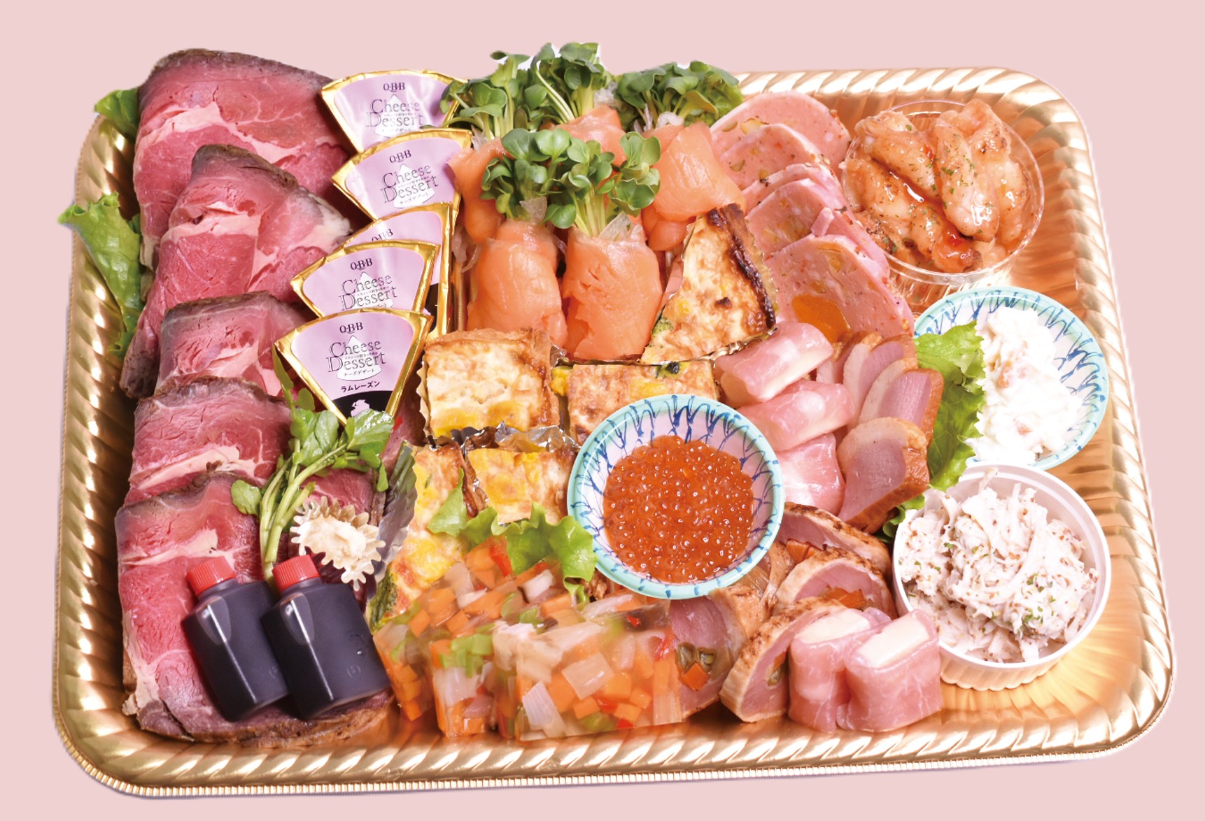 自家製ローストビーフ/スモークサーモンのカイワレ巻き/オードブルチーズ/アプリコットベーコン巻き/ハムと野菜のゼリーよせ/