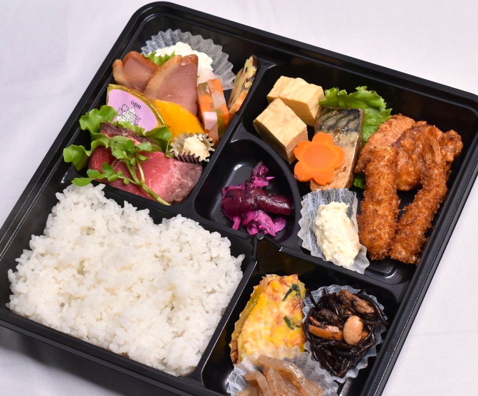 オードブル盛り合わせ/ローストビーフ/大エビフライ/チキン唐揚げ/サバ生姜煮/だし巻き卵/惣菜3品/ライス/漬物