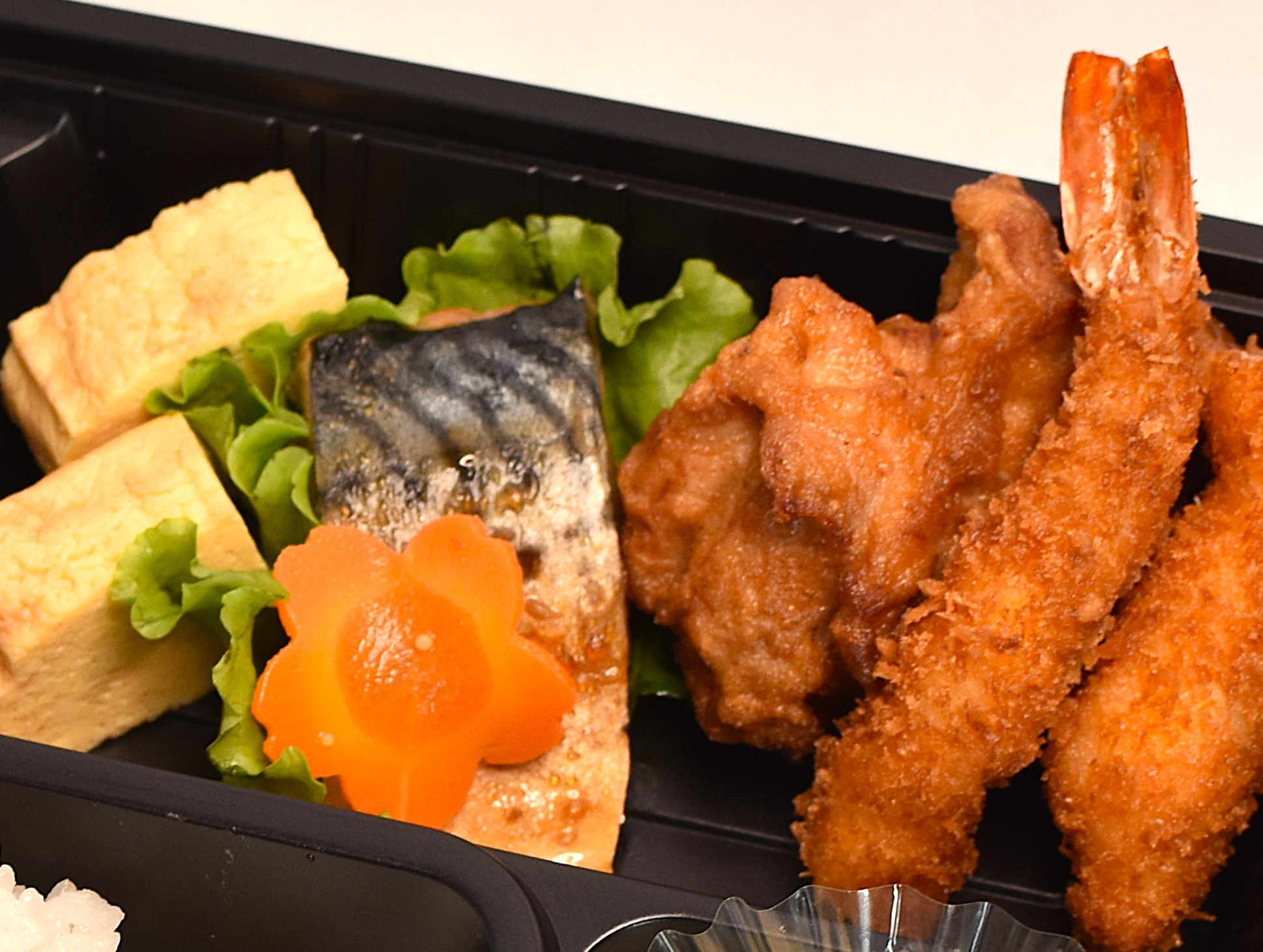 エビフライ・唐揚げなどの洋食と、鯖の生姜煮・だし巻きなどの和食を一つにまとめました。