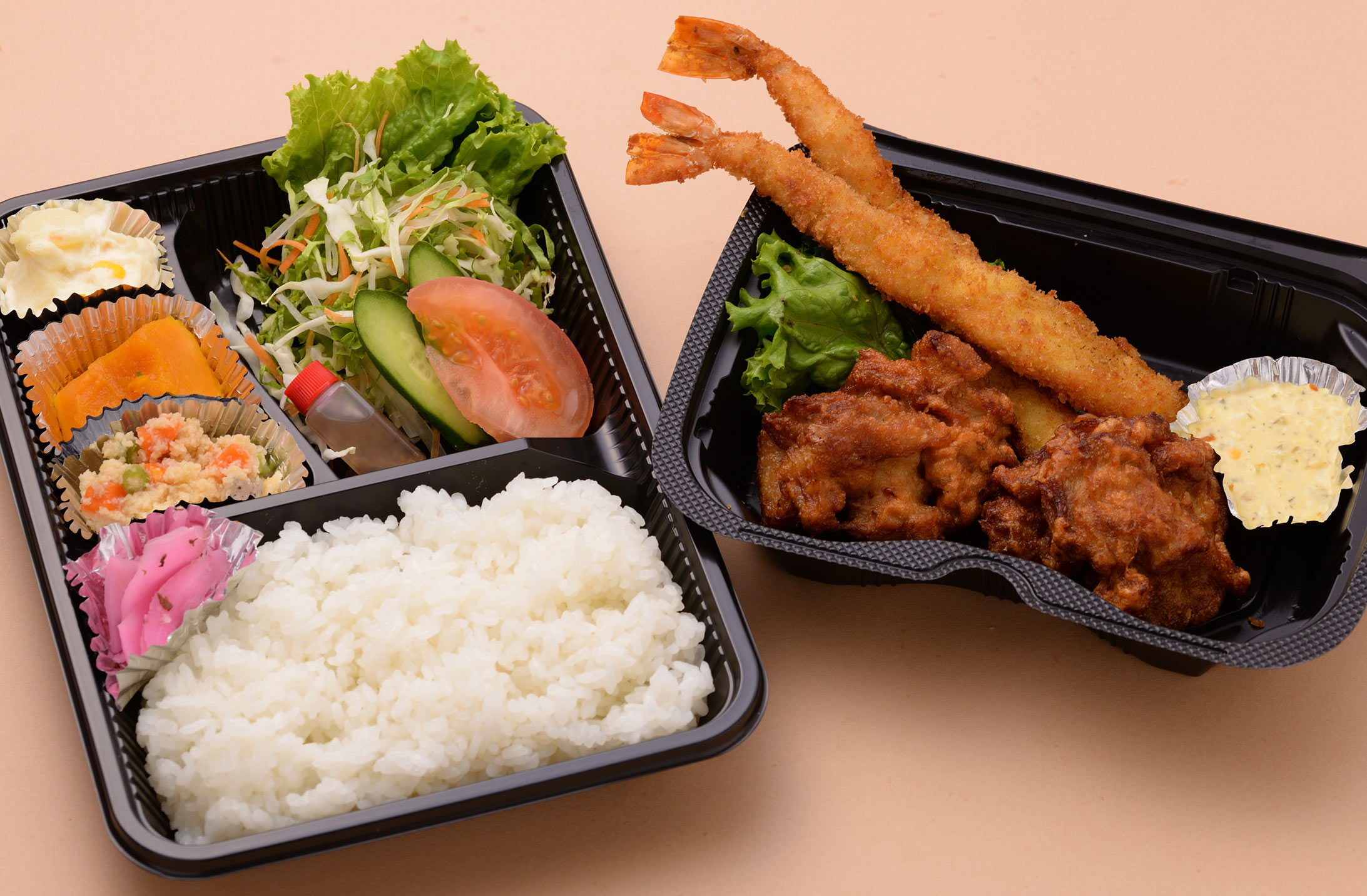 大エビフライ2本と唐揚げが3個ずつ入ったボリューミーなお弁当です。