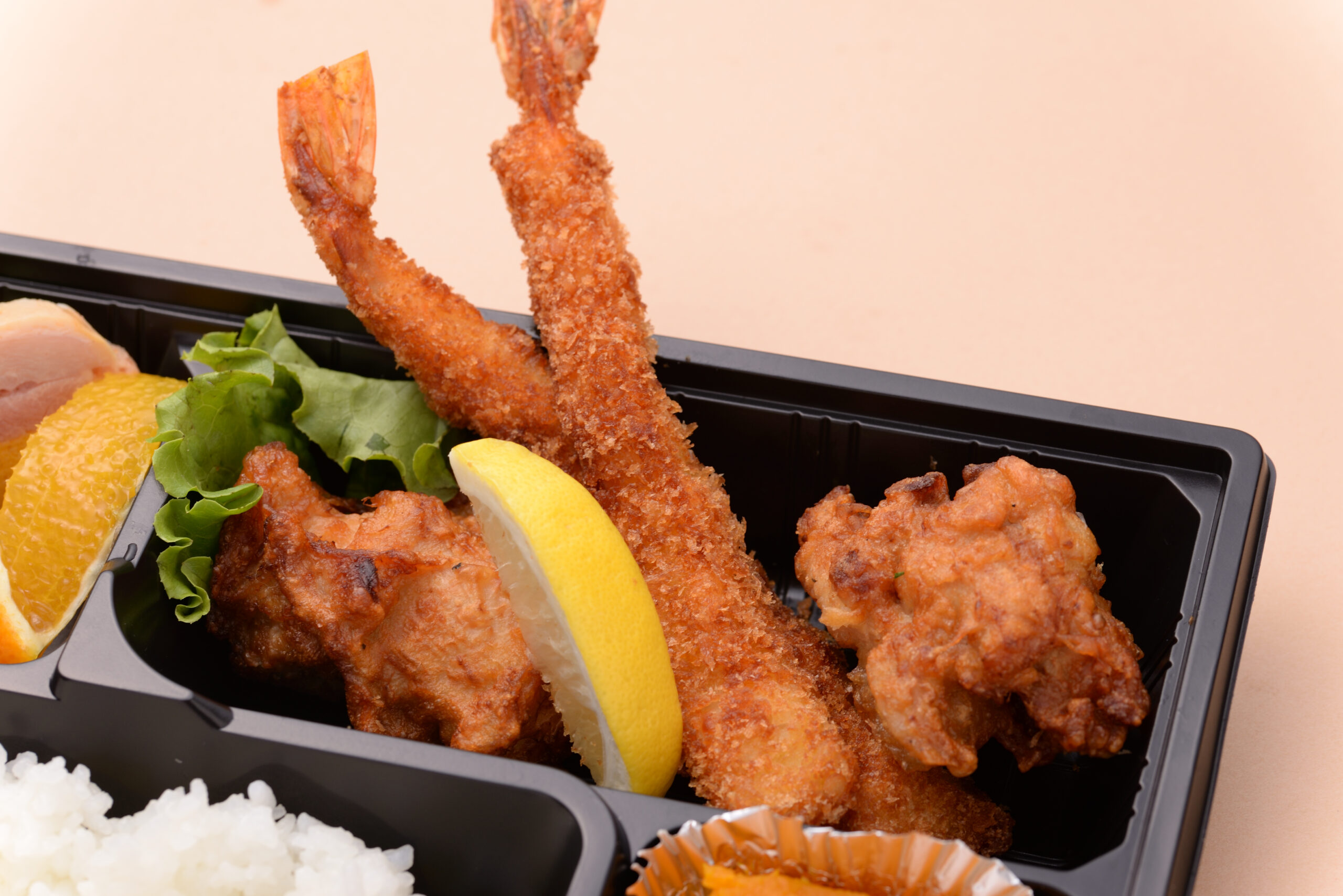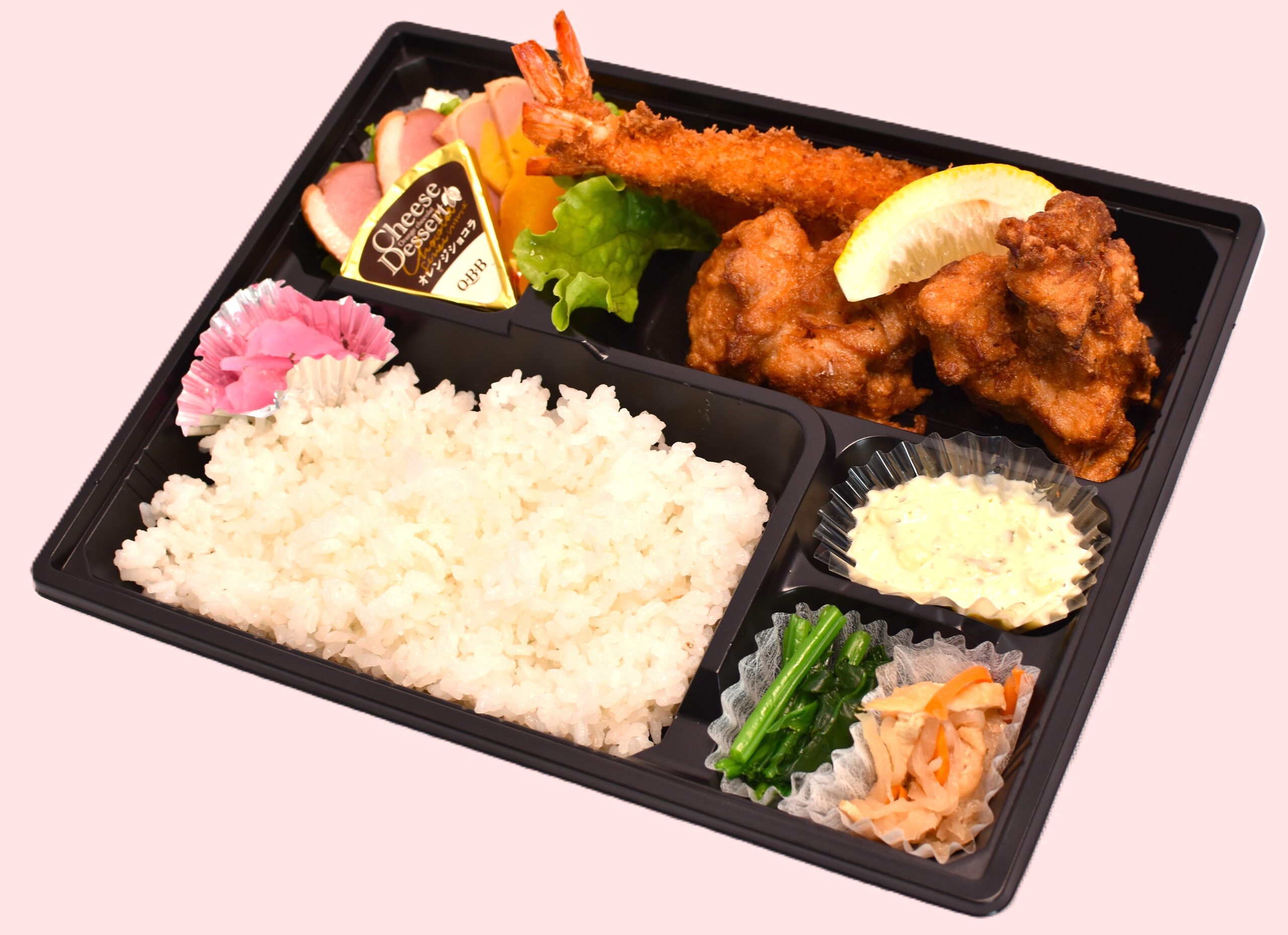 唐揚げとエビフライの安定ペアが入った洋風のお弁当です。